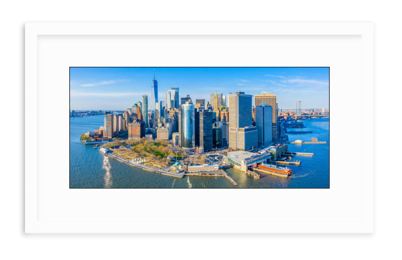 Aerial view of the Lower Manhattan financial district skyline, featuring One World Trade Center (Freedom Tower) and Battery Park, from New York harbor looking north with views of both the Hudson and East Rivers. This photo was taken in 2020.